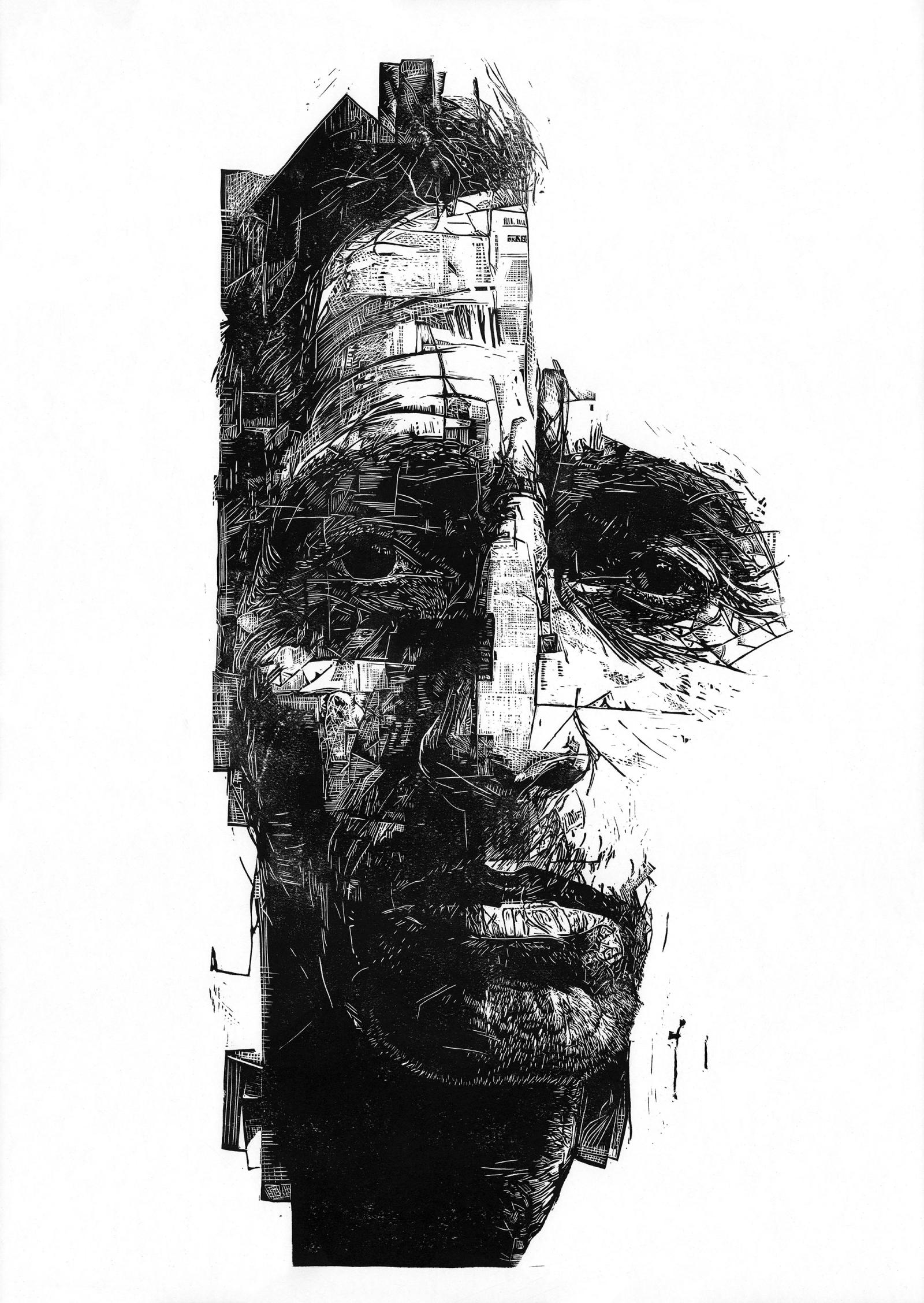 This lino print is an exploration of the evolving relationship between AI and human creativity. In creating this piece, I embarked on a journey to understand the potential future roles of AI and how we, as humans, can coexist with these advanced technologies. The process began with MidJourney, a visual AI generator, which produced the initial face for the artwork. I then manipulated the AI-generated image on the computer before transferring it to lino by hand. The final steps involved meticulous hand carving and hand printing.